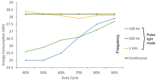 Energy consumption behavior for 95R5B light recipe at 110 µmol m−2 s−1 with different pulsed frequencies and duty cycles.