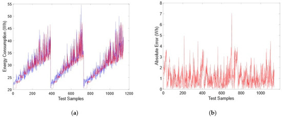 FNNs model results in Test 1. (a) Data estimated (red) versus energy consumption data measured (blue). (b) Absolute error between estimated behavior and measured energy consumption (red).