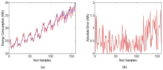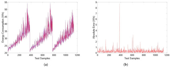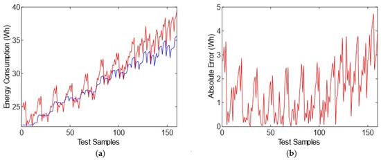 FNNs model results in Test 2. (a) Data estimated (red) versus energy consumption data measured (blue). (b) Absolute error between estimated behavior and measured energy consumption (red).