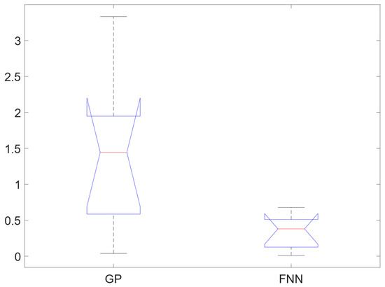 The estimated errors (MAE, MSE, SEE, and MAPE) for each nonlinear model (GP model and FNNs) in Tests 1 and 2 were integrated and associated with a new group of analyses (box plot and ANOVA). According to results obtained in the ANOVA and the graphic (box plot), it was determined that the FNNs model showed the best performance, considering the error and variance values, as observed in Figure 8. Furthermore, the ANOVA with supports these results, given that the established hypothesis (the error FNN < GP) is true with a 1.55% risk (Table 7).