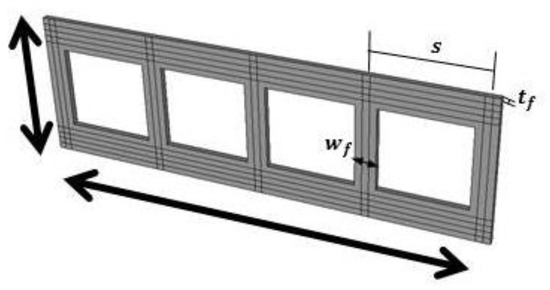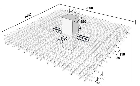 The FRP design guidelines provided in the design standards are modified based on steel reinforced concrete. Current design codes have an identical general form for calculating shear strength as the sum of the shear strength of concrete and shear reinforcement by Equation (1). However, in each code, the amount of shear reinforcement is considered as a different ratio. In this study, the GFRP vertical grid, whose performance has been verified in previous research (Kim et al. [15]), was determined as the shear reinforcement for the concrete flat plate as shown in Figure 1.