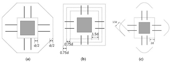A total of nine specimens were manufactured of which eight were shear reinforced with GFRP vertical grids and one did not have any reinforcement. Figure 3 shows a plane view of the specimen. The specimens had dimensions of 2000 × 2000 mm; the slab was 180 mm thick. Column dimensions were 250 × 250 mm; the height of the upper column was 300 mm and that of the lower column was 150 mm. The GFRP shear reinforcement was placed along the four sides of the column as described in Figure 3. Table 2 presents the specimen details. The specimen labeling method represented the variables of this study such as the amount and the spacing of the shear reinforcement. The control specimen was the plain slab without shear reinforcement. G represented the specimens that were shear reinforced with a GFRP plate. The amount of shear reinforcement () was the product of the cross-sectional areas of the vertical strips of the GFRP grid in the critical section needed for the shear strength calculation and the tensile strength. A, B and C represented the spacing of the vertical strips of the shear reinforcement and they were 40 mm (0.3d), 69 mm (0.5d) and 104 mm (0.75d), respectively. To evaluate the shear performance, this study was designed to induce a punching shear failure rather than a flexural failure. In this case, the flexural strength was computed by the yield line theory by Johansen [18]. Johansen suggested the calculation of the maximum flexural strength, , demonstrated by the plasticity bending moment of the slab with simple support from the four sides as shown in Equation (8).