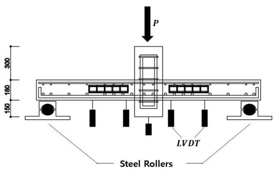 The slabs were installed on a reaction frame as a hinge that was manufactured for the experiment and simply supported the four sides. In addition, the weight was stocked at an average speed of 1 kN/min using an actuator with a capacity of 1000 kN installed on the top of the column and as the top and bottom parts of the specimen became contrary to the conditions of the real structure based on the loading direction. Furthermore, the displacement of the specimen was recorded by installing five linear variable differential transformers (LVDTs) on the lower part of the specimen. Figure 5 shows the specimen settings.
