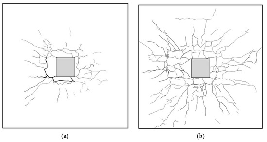 Distribution of cracks on specimens at maximum load: (a) Control; (b) G-246B.