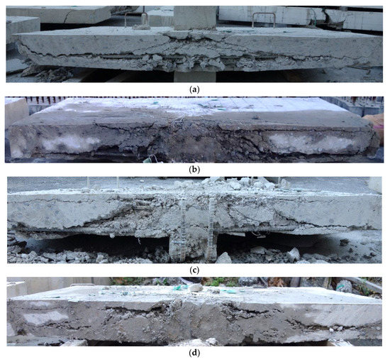 Figure 6 indicates the crack patterns of the control and the G-246B specimens and Figure 7 shows the appearance of the shear observed when a concrete cutter was applied at a spot 100 mm away from the column face of all of the specimens. Cracks started to propagate from near the column outwards along two directions on the slabs. The initial cracks of the specimen were observed in a radial shape from the side of the columns then cracks were extended from the central area as loading increased. The control specimen showed a typical punching shear failure mode in which the cracks started at the column side and developed significantly in the shape of a cone within half of the effective depth of the slab and a sudden drop was observed in the load after the maximum load. The initial crack in the specimen with the GFRP plate reinforcement was generated near the column and then cracks occurred within the critical section of the slab. As the load increased, the crack expanded in the slab in two directions similar to the control specimen. It was observed that the width and number of cracks expanded from the shear reinforcement area. In addition, the cracks developed widely toward the edges and the corners of the slabs. The G-246B specimen had larger failure areas than the control specimen (Figure 6). This indicated that the shear reinforcement produced the reinforcement effects of increasing the areas of the critical sections of the flat plate and that more concrete resisted the shear.