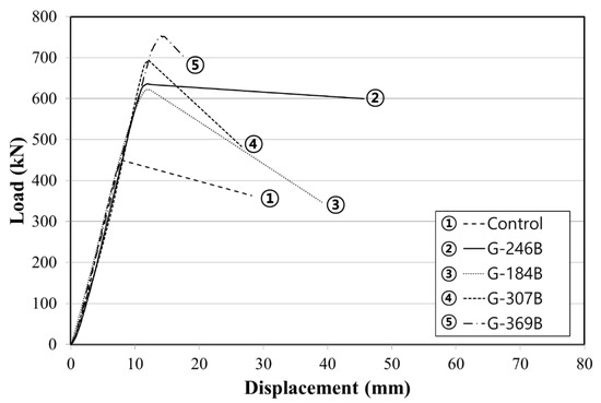 Figure 8 indicates that all specimens showed almost similar behavior before applying a load of 400 kN, at which point a shear crack occurred in the specimen. In the case of the control specimen, it was verified to show a dramatic brittle failure condition and was unable to resist the shear after the shear crack was observed. In the case of the G-246B specimen, the specimen was verified to have a high shear strength in resisting shear cracks. When comparing the maximum load of each specimen with or without shear reinforcement, the maximum load of the specimen with a GFRP vertical grid was found to be approximately 635 kN whereas that of the control specimen was 450 kN; here, the difference of 185 kN between the strengths of the G-246B and the control specimen represented the shear strength contribution of the GFRP plate.