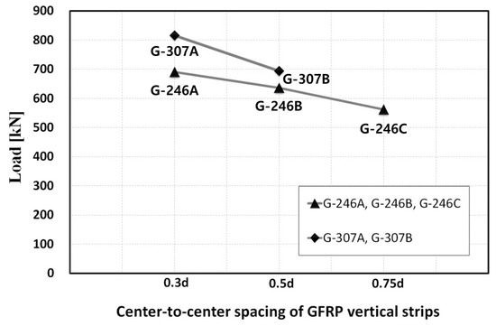 The specimens were composed of two groups with the amount and spacing of shear reinforcement as test variables and the shear strength attributed to the spacing of the vertical strips of the shear reinforcement was analyzed. Figure 9 shows the comparison of the maximum shear strengths for each group. The shear strength of the specimens was found to increase as the spacing between the vertical strips decreased in both the amount of shear strength 246 kN and 307 kN group. The G-246A, G-246B and G-246C specimens, in which the amount of the shear reinforcement was designed to be equal (246 kN) and the reinforcement spacing was 0.3d, 0.5d and 0.75, respectively, had a greater shear strength because the reinforcement spacing was smaller. Considering the G-246C specimen as a reference, the shear strength increased by 12% for the G-246B specimen and by 22% for the G-246A specimen. For the G-307A and G-307B specimens in which the amount of shear reinforcement was designed to be equal (307 kN) and the reinforcement spacing was 0.3d and 0.5d, respectively, the specimen with the reinforcement spacing of 0.3d had a greater shear strength. Furthermore, the shear strength of the G-307A specimen exceeded that of the G-307B specimen by 17%. Both groups had the greatest maximum load when the spacing of the shear reinforcement was 0.3d.