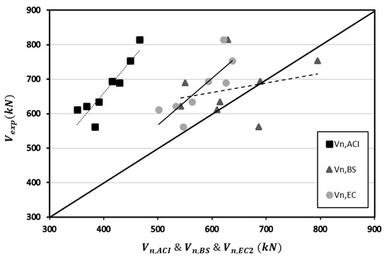- When comparing the test results with the computed shear strengths using the equations of ACI 318, BS 8110 and Eurocode 2, we found that BS 8110 with an average ratio of shear strength of 1.06 and a standard deviation of 0.15 and Eurocode 2 with an average ratio of shear strength of 1.16 and a standard deviation of 0.08 yielded shear strength values closer to the experimental values than ACI 318. This was because they incorporated the effects of the tension reinforcement ratio. ACI 318, with an average ratio of shear strength of 1.67 and a standard deviation of 0.12, underestimated the experiment results.