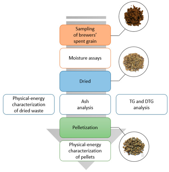 Most research works have been devoted to the nutritional value of BGS, especially concerning its effect on the diet of animals [9,10,11,12]. In other cases, it has been studied in an effort to improve organic matter content and, thus, increase crop productivity, while it has also been explored as a graphene alternative for the production of screen-printed electrodes [13,14]. Nevertheless, this waste has also been assessed for energy production [15]. In fact, there are research works about biodiesel [16], biogas [17,18,19], ethanol [20], biohydrogen [21], or biobutanol [22] production from this waste. Although scarce, there are some research works dealing with the possibility of the use of this waste as a solid biofuel. Thus, Manyuchi et al. [23] analyzed the electricity production of a turbine which was fed by a boiler with BSG. Weger et al. [24] carried out a mechanical pretreatment with a screw press. Afterward, they mixed the solid phase with wood chips and carried out different combustion tests, obtaining low CO emissions, although high NOx and dust particle emissions were found.