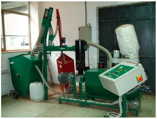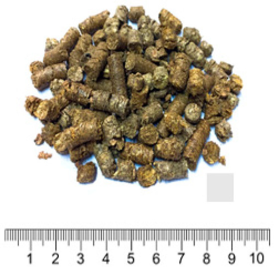 We made pellets using a pelletizer with a rotative flat die (Kovo Novak, MGL 200). Figure 3 and Figure 4 show the equipment used for pelletizing and the pellets obtained after densification, respectively.