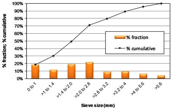 Furthermore, the bulk density value was 211 kg·m−3 (wb), slightly lower compared to other biomass wastes with similar moisture values, such as granulometric separation powder (379 kg·m−3 wb) [48]. Low values of this parameter allow its considerable increase after pelletizing. The densification ratio shows the increase in bulk density due to pelletization. Figure 5 shows the granulometric analysis. It can be observed that the median of the particle size distribution was 2.03 mm. Only 20% of the sample showed a particle size higher than 3.15 mm (recommended maximum size for densification processes) [49]. Therefore, granulometry of this waste is suitable for the pelletizing process, and pretreatments such as grinding or sieving are not necessary.