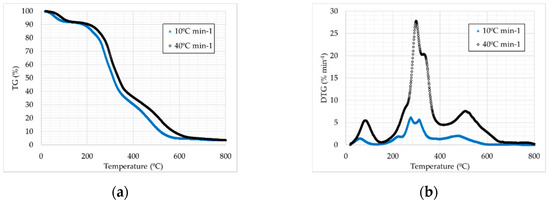 This study was carried out using a thermobalance (SDT Q600, TA instruments), using synthetic air (oxidative atmosphere) and argon (inert atmosphere) at a flow rate of 100 mL·min−1 for two different heating rates (10 and 40 °C·min−1). Samples of 10 ± 1 mg weight with a particle size of less than 250 µm were used. The analyses were carried out in a temperature range between 20 and 800 °C, and continuous weight measurements were obtained throughout the heating process.