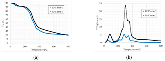 DTG curves (Figure 6b and Figure 7b) at two heating rates were qualitatively similar, consisting of one small shoulder peak, one pronounced double peak, and one long tailing. In an oxidative atmosphere, an additional peak was observed.