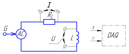 A simple measuring circuit (Figure 1) consisting of a laboratory AC source (AC) controlled from an external analog generator (G), which sets the shape, amplitude, and frequency of the current, a research object (L); a precision specially developed non-inductance shunt (RS); and a data acquisition system (DAQ) is used to study the losses by the direct electric method.