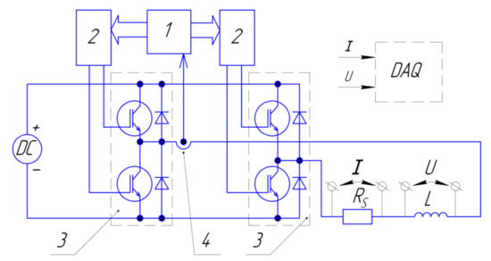 Inverter simulator for HTS devices. 1—microcontroller, 2—transistor drivers, 3—transistor assemblies with built-in protection diodes, 4—feedback sensor, (DC)—laboratory power source, (Rs)—noninductive current shunt, (L)—device under test, and (DAQ)—data acquisition system.
