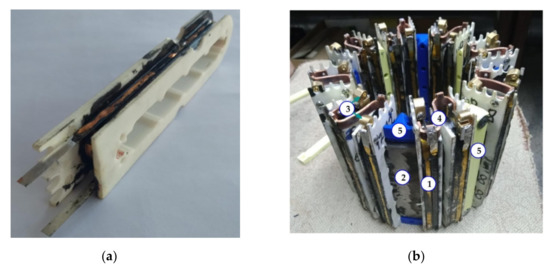 (a) Manufactured racetrack coil prepared for soldering of current leads and potential taps; (b) assembled package of annular stator winding (without wiring). 1—HTS coil, 2—iron yoke, 3—brass connectors, 4—copper bridge between coupled coils, and 5—positioning elements between coils.