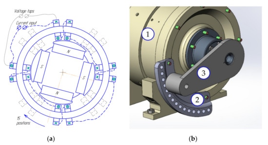 (a) Schematic representation of an annular winding with an inside-mounted rotor; (b) locking device for the rotor. 1—assembled machine with HTS windings, 2—fixed plank with 15 holes, and 3—“arrow” device, fixed on shaft of the rotor.