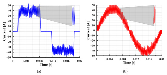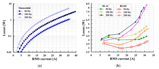 For more clarity, on the Figure 7a,b, two periods of current are shown: BLDC and BLAC. Due to the concept of obtaining currents of this form, which is associated with chopping relatively high voltage using transistors [30,31], a large amount of electromagnetic interference occurs, which significantly complicates the computer processing of experimental data. For a pure sine, 3 to 5 signal periods are sufficient to accurately determine the losses at a given current amplitude. However, for the currents shown in Figure 7a,b, the situation changes significantly.