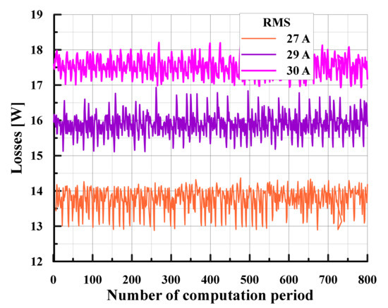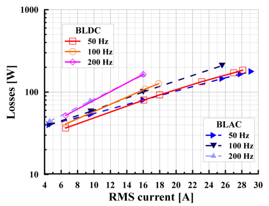 Figure 8 shows the dependence of the losses calculated on the period for three current levels. Moreover, the representation of the dependence of losses on the amplitude value of the current, in contrast to the pure sine, is difficult and ambiguous. In this regard, all the graphs in this paper, where the current form BLDC and BLAC appears, use the effective (RMS) current value.