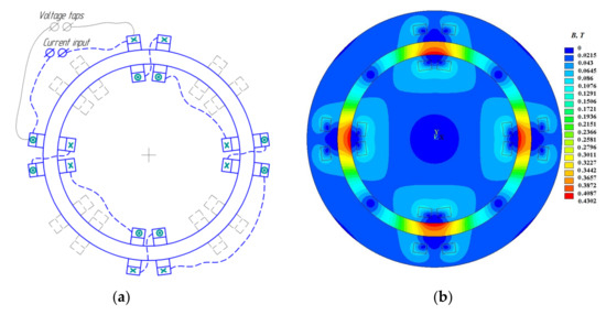 At the first stage of this section of research, the stator of an electric machine with an annular winding was manufactured (Figure 4b) [29]. Such type of winding allows for researching the worst case when HTS tape is oriented perpendicularly to the inductor magnetic field. The winding is made in a two-phase design to simplify manufacturing and assembly, with each of the phases consisting of eight coils. The coils are grouped into pairs that are evenly distributed along the length of the yoke circumference. The other phase has a similar design and is rotated 45 degrees relative to the first one.