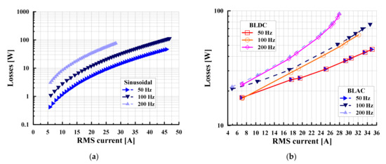 (a) Solitary coil losses at pure sine; (b) solitary coil losses modulated waveforms (BLAC, BLDC).