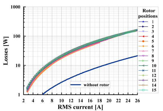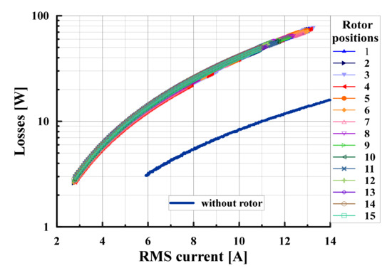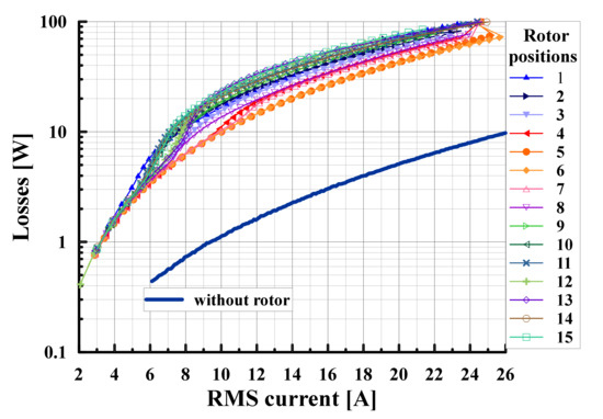 At the end of the sequence of the experiment with the braked rotor, the phase was tested by modulated currents in different positions of the installed rotor. Similar to the case with a sinusoidal current, the loss levels showed a weak dependence on the angle of installation of the rotor, so, in this regard, the graph (Figure 15) shows the average values for each frequency.