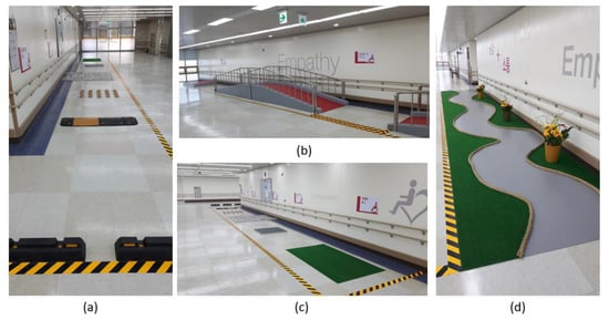 (a) speed bumps, braille beam block, general-purpose road curb; (b) ramps of similar standards to those installed in Korean public institutions and out-doors; (c) various types of flooring panels with different materials and roughness; and (d) general curve reflecting road conditions.