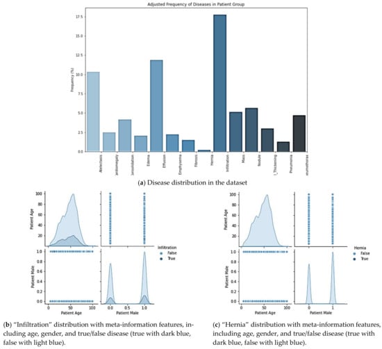 The distribution of diseases in the dataset: the figures (a,b) represent the least frequent disease, “Hernia”, and the most frequent disease, “Infiltration”, and include (c) the meta-information which are age, gender, case positive or negative.