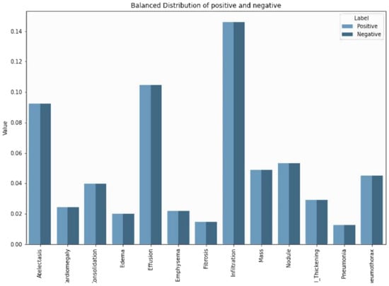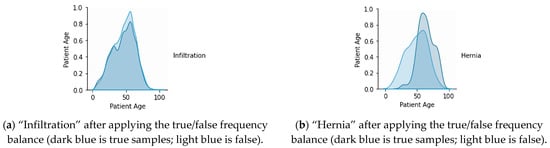 The dataset was imbalanced and biased, as the difference between “Hernia” (227 samples) and “Infiltration” (more than 17,000 samples) shows. We tried to focus on the positive and negative frequency. As we can see in Table 2b, the false class samples were much higher than the true class samples (Ex: Edema True: 2303, False: 109,817 prevalence: 2.05%). To solve the class imbalance problem, we tried to include meta-information. At first, we used the patient age as the reference and then balanced the positive and negative samples for each disease by multiplying the weight of the positive cases with the negative sample frequency and did the same for the negative weight. The result is better illustrated in Figure 3 and Figure 4 for both the least most disease frequencies.