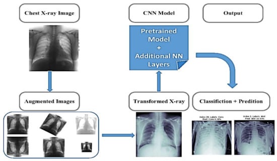The advances in deep learning and large datasets allow the algorithm to match the performance of medical professionals in various medical imaging tasks, including the detection of diabetic retinopathy [12], the classification of skin cancer [13], and metastases in the detection of lymph nodes [14]. The automatic diagnosis of chest imaging has attracted increasing attention [15,16] and special algorithms have been developed for the detection of pulmonary nodules [17], but to detect other diseases, such as pneumonia and pneumothorax, a method to classify multiple pathologies at the same time is suggested. Nilanjan, Dey et al. [18] developed a new method to detect pneumonia by computing the handcrafted features from the chest X-ray with the use of a modified VGGNet19 (Visual Geometry Group Network) [19]. This method achieved a 97.94% classification accuracy (Check Table 1). Until recently, computing power and the availability of large datasets allowed this approach to flourish. The National Institute of Health published ChestX-ray14 [20], which has led to many studies using deep learning for diagnosis from chest X-rays [21,22,23,24].