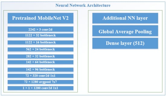 Convolutional neural networks are the most widely used methods from ImageNet [25]. We want to deliver high accuracy results while keeping the parameters and mathematical operations as low as possible to bring deep neural networks to mobile devices. The MobileNet V2 architecture [26] was designed to create small, low-latency applications such as computer vision and IoT applications in many fields, namely fruit image classification for higher fruit production rates [27]; an artificial intelligent diagnostic system was built for cholelithiasis [28].