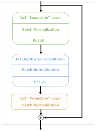 The bottleneck residual block was mainly composed of three convolutional layers. As listed in Figure 6, the last two are the ones that already existed in the first generation of MobileNet: a depth-wise convolution that filters the inputs, followed by a 1 × 1 pointwise convolution layer. However, this 1 × 1 layer now has a different job.
