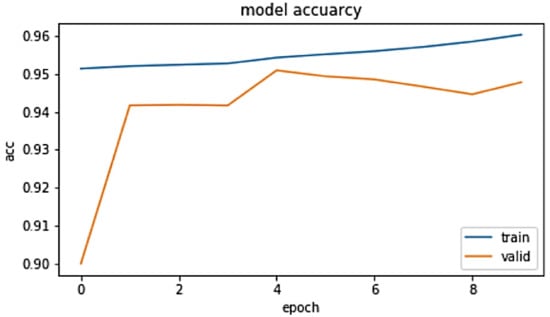 The lack of computing power had a big role in limiting the experiment. In this work, we used the “Kaggle” open free cloud to edit and experiment with our model. Although this cloud offers a free GPU and fifteen gigabytes of ram, it was not enough to train our model over ten epochs. However, we managed to get a good result (Check Figure 8 and Figure 9). We started by viewing the accuracy of the model and in the first epoch we had (0.951) a training accuracy and (0.913) a validation accuracy, with a difference of 3.74% between the training and validation. In the epoch number, the fourth gap between the training and validation accuracy gets much smaller with a training accuracy of 0.953 and a validation accuracy of 0.941. The difference decreases to 1.18%. In the last epoch, and we got some overfitting signs, with an increase in the difference between the training accuracy and validation accuracy with more than 2% of a difference.
