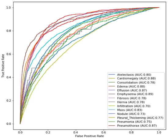 For the “Emphysema”, the AUC is (0.891), and the “Effusion” and “Edema” got 0.876 and 0.884, the “Pneumothorax” and “Cardiomegaly” also had a good AUC, with 0.880 and 0.885 and “Mass”, “Hernia” and “Atelectasis” had a good AUC (0.826, 0.811 and 0.794). For the other diseases—"Consolidation”, “Fibrosis”, and “Pleural Thickening”—the was similar (0.790, 0.762, 0.763). The last three diseases got the lowest AUC: “Nodule” and AUC of 0.743; “Pneumonia” an AUC of 0.733; and “Infiltration” an AUC of (0.701).