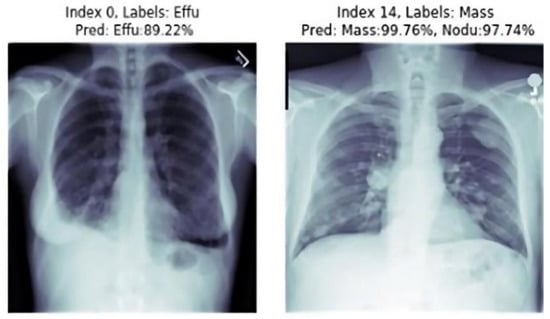 As we can see in the image with the index zero from Figure 9, the ground truth label was “Effusion”. Knowing that the model had AUC 0.89, the result was not surprising in that it gets 89.22% as a prediction. For the second image, we can see that the model starts getting a compromise and that the true diseases in this picture was “Mass”, and the prediction of the models of two diseases got a prediction rate higher than 97%.