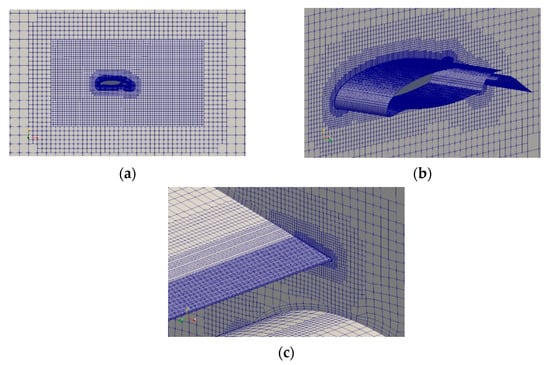 3D mesh generated around profile S5HL. (a) CFD mesh including far field. (b) Detail view of CFD mesh around the wing. (c) Channel between the wing main part and the flap.