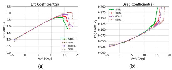 Lift coefficients cl calculated for the high-lift profiles are plotted as functions of the angle of attack (AoA) in Figure 4’s left hand side. In general, the cl increases with the AoA. At a certain angle, stall occurs and the cl suddenly drops. As the LE is lowered from S4HL to S5HL, the stall is delayed to higher stall angles. The maximum values of lift coefficient cl,max and stall angles of the high-lift profiles are listed in Table 1. By changing the profile from S4HL to S5HL, cl,max is increased by 14% from 2.80 to 3.06. The stall angle is also increased from 14.2 to 16.4 degrees.
