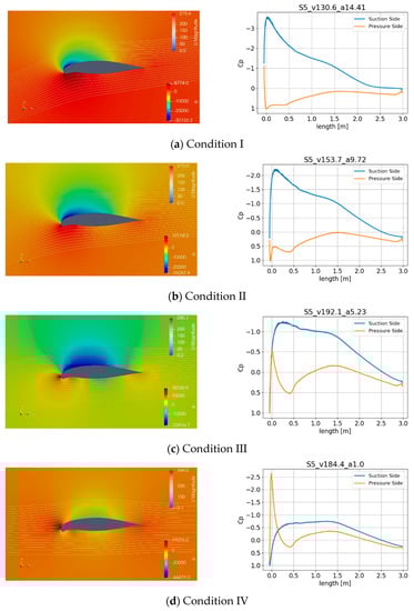 Pressure and flow (left) and cp distribution (right) for cruise profile S5 in four extreme conditions.