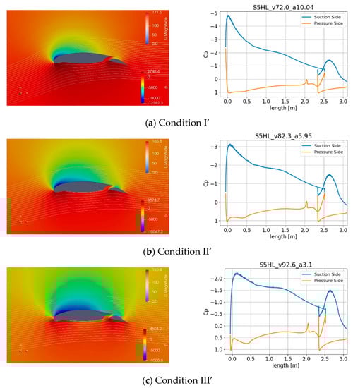 Pressure and flow (left) and cp distribution (right) for high-lift profile S5HL in three extreme conditions.