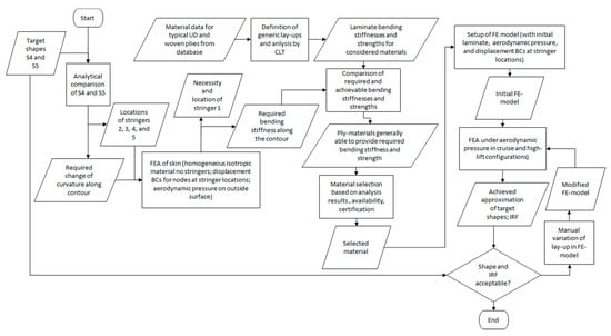 Tailoring the stiffness of the MLE skin along the contour was achieved by suitable composite laminate lay-ups, varying the skin thickness by ply drop-offs in the laminate. These were determined in another iterative process based on finite element analysis (FEA) of the structure. Models consisted of linear shell elements (ABAQUS element type S4R, i.e., with reduced integration) with displacement boundary conditions imposed at the top edges of the stringers. The upper edge (approximately parallel to the span-wise direction) of the skin-contour, where it would be fastened to the wing’s front spar, was fixed in all directions (translational and rotational), and the aerodynamic pressure distribution for the respective flight condition (cruise or high-lift) was applied to the outer surface of the skin. The solutions were obtained using an implicit solver and considering geometric non-linearity. This way, the reaction forces occurring at the locations of the displacement boundary conditions are equivalent to the forces applied by an actuation system holding the skin in the required shape under the respective aerodynamic pressure load. Lay-ups were manually modified, and the resulting stresses due to morphing and aerodynamic pressure loads were analysed by the FEM. Subsequently, the IRF according to Puck’s failure criterion as well as the deviation from the target shapes were determined from the FE-solution. Based on these, further modifications of the lay-ups were made, and the process repeated until a suitable solution had been found. A simplified flow-chart of the process for defining the skin laminate is shown in Figure 7.