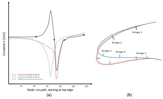 Curvature analysis for placement of stringers (schematic); (a) abscissa: Location along the MLE-contour; blue: Curvature along contour S4, red: Curvature along contour S5, grey: Difference between S4 and S5 curvatures, grey squares: Selected locations for stringers 2 to 5 (region of stringer 1 does not change curvature very much anyhow); (b) Blue curve is S4, red curve is S5 (not to scale).