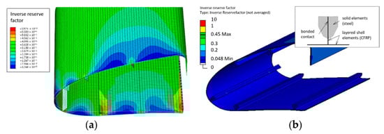 Inverse reserve factors due to thermal residual stresses in the undeformed skin for cooling to −45 °C; (a) ABAQUS-model (linear shell elements) of the CRFP-only stringers largely shows inverse reserve factor (IRF)-values (even without morphing) of ca. 0.35 (green) and above; (b) ANSYS-model (linear shell elements—here displayed with their specified thickness) shows IRF-values mostly around 0.1 and below (also without morphing); upper right corner: Design principle of the stringer-reinforcement assumed for the ANSYS-model (this has since been superseded by the design shown in Figure 11).