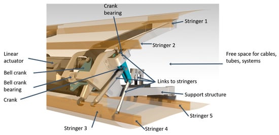 The drive mechanism is driven by a linear electromechanical actuator. Its orientation in spanwise direction allows to design an actuation system that leaves approx. 50% of the cross section as free space for cables, tubes, and other systems to be placed in the leading edge of the wing. A bell crank deflects the linear movement of this actuator into the desired direction of movement for stringer 3, which is an oblique movement pointing downwards and to the front. Stringers 2, 3, and 4 are connected to a crank by links. Stringer 5 is connected to the support structure by a link. The geometry of these links and the crank together with the stiffness properties of the skin define the relative position of the stringers, resulting in an aerodynamically feasible aerofoil for any actuator position.