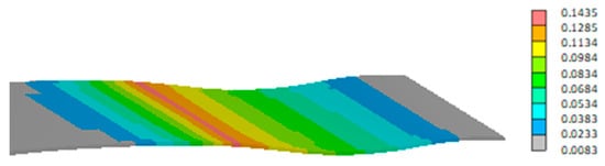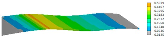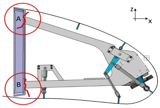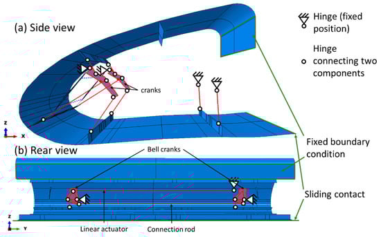 In Figure 15a, all components of the drive mechanism are highlighted in red, which move in the x-z-plane. In Figure 15b, those components of the drive mechanism are highlighted in red, which move in the plane of the bell crank and the linear actuator. The hinges with a fixed position are supposed to be connected to the support structure. All parts of the drive mechanism are modeled as rigid parts, whereas skin and stringers are deformable with the local material properties and ply stack sequence assigned. The actuator is represented by a “translator” feature, changing its length in order to move the MLE into the desired position. This movement drives the bell crank on the left hand side of Figure 15b. A connection rod between the two bell cranks makes them move synchronously. The sliding contact at the rear bottom end of the leading edge was modeled using frictionless perpendicular behaviour. Abaqus was used as FE software for this model. Skin and stringers were discretised using quadratic quadrilateral shell elements (S8). The bending stiffness of the shell elements representing the stringers are set equal to the bending stiffness of the stringer profiles described in Section 3.2. This allows us to model the behaviour of the stringers without modeling details of their geometry. Stringers and skin are modelled as one part in the FE model. This part has been meshed with an average element size of 10 mm × 10 mm. In total, the mesh contains 22,976 Elements and 66,320 nodes. A static general procedure was used with an implicit solver, considering geometric nonlinearity.