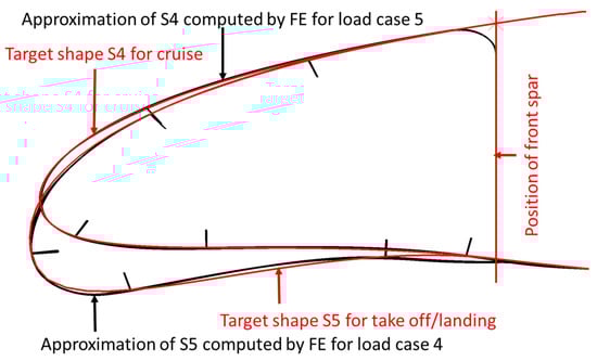 In order to reduce material strain and required actuation forces, an “intermediate baseline” between the geometries S4 and S5 was derived, see Figure 13. From this “intermediate baseline” the MLE can be moved up into aerofoil S4 for cruise or down to aerofoil S5 for take-off and landing. This intermediate baseline needs to be compatible with the movement of the kinematic system. Hence, the intermediate baseline was derived from a simulated intermediate shape of the skin resulting from an intermediate position of the drive mechanism.