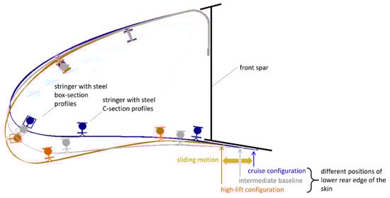 Schematic view of cruise-configuration (S4, blue), intermediate baseline shape (grey), and high-lift configuration (S5, orange) of the MLE; CFRP-stringers are each stiffened by a pair of steel profiles with box- or C-shaped cross-sections, respectively—the figure shows their cross-section including the fittings for the kinematic system (see Figure 11 for more detail); the rearward extension of the MLE’s skin slides along the lower surface of the front spar.