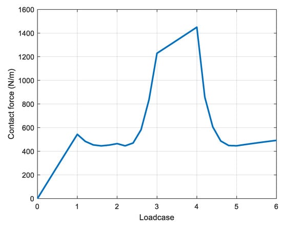 Contact force per meter span at the sliding contact for the load cases given in Table 4 computed with the FE model described in Section 4.2.