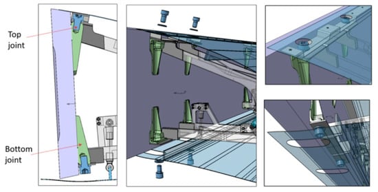After the review of the system boundaries, it is clear that the MLE is best realized as a preassembly, which is then attached to the front spar in one piece. The areas most easily accessible are at the top and bottom of the front spar. Therefore, the interfaces between MLE and front spar are best positioned there, see Figure 29. Apart from accessibility, the proposed design with its two-point support offers advantages, such as reduction of force and moment reaction in the joint compared to a single-point support, as well as sufficient space for cable routes between the two joints.