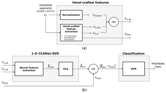 Classification processing pipeline of our method. (a) Feature extraction: for each of the two leads , hand-crafted features are extracted to build while , a vector of time-domain features, is built for both leads. (b) Part of these features, , feeds the 1-D CCANet-SVD module, which first outputs the neural features and then a reduced version of the neural features . The concatenation of and feeds the classification module. The output is the predicted heartbeat class.
