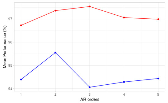 Mean performance for different AR orders on validation sets for MIT-BIH signals (red) and INCART signals (blue).